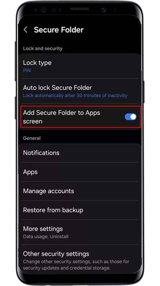 • مطمئن شوید که در تنظیمات «Secure Folder»، گزینه « Add Secure Folder to Apps screen» روی حالت فعال باشد.