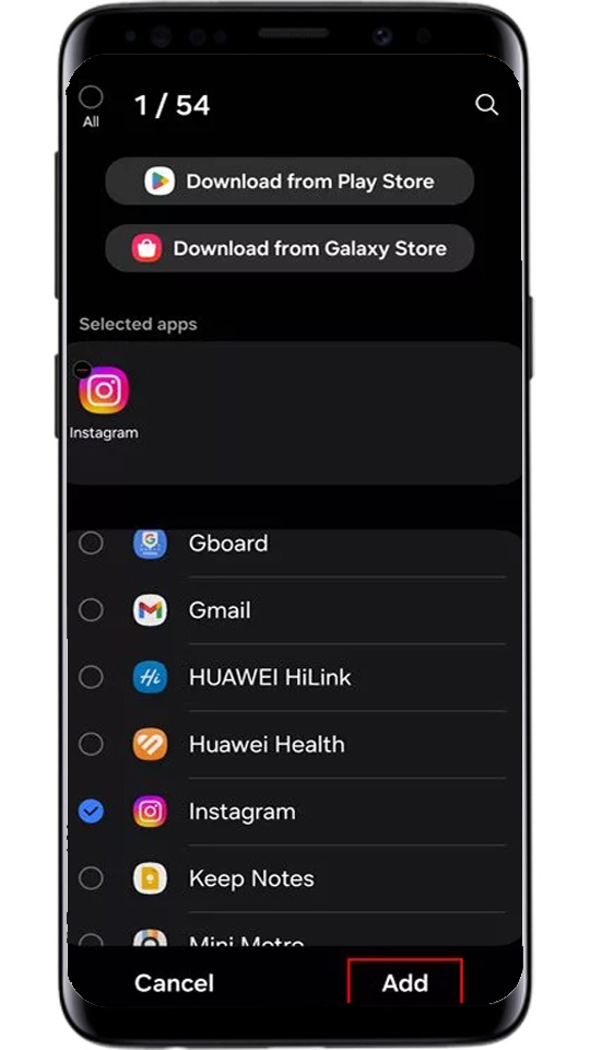 • از آن لیست، برنامه اینستاگرام را انتخاب کرده و گزینه افزودن «Add» را بزنید.